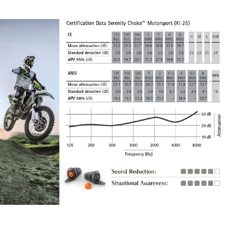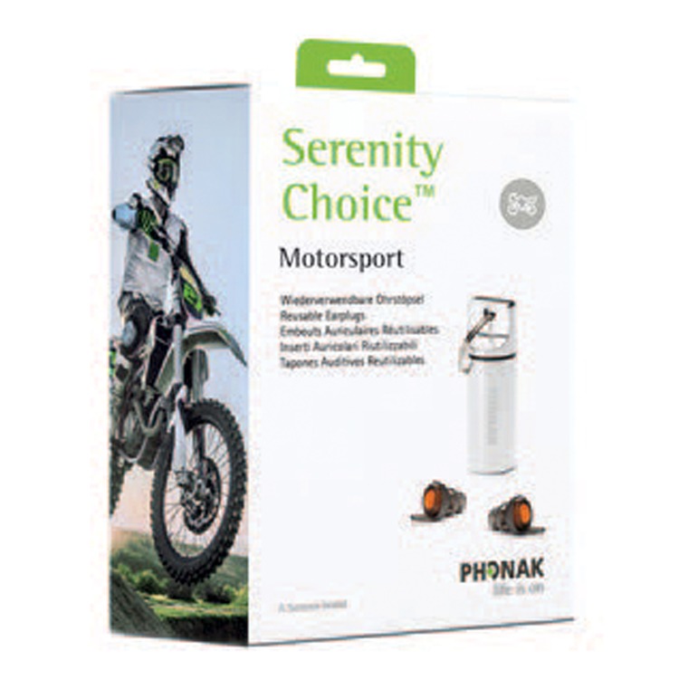 A pair of Phonak Serenity Choice Motorsport Reusable Earplugs with 24dB acoustic filters