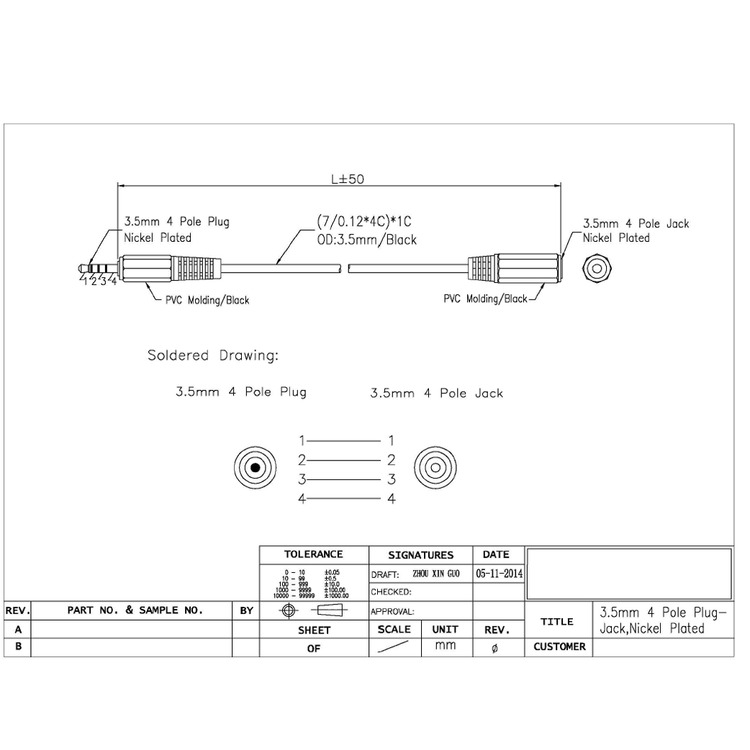Black 3.5mm 4-pole jack plug to socket extension lead Moulded plugs & strain reliefs