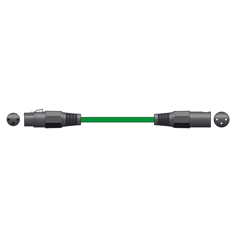 Terminated at one end with a male XLR connector and at the other end with a female XLR connector.